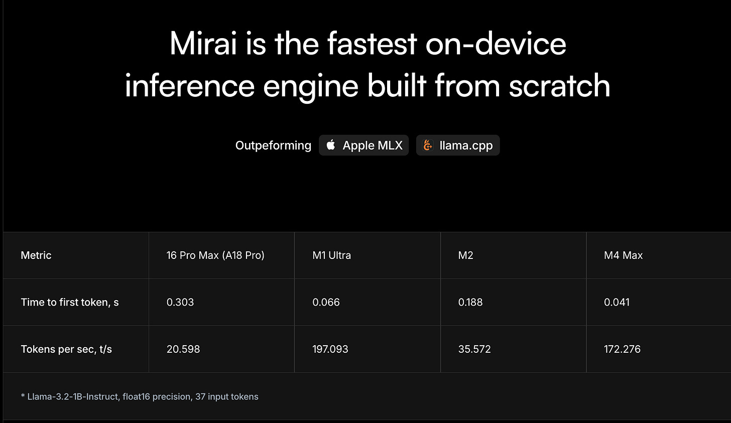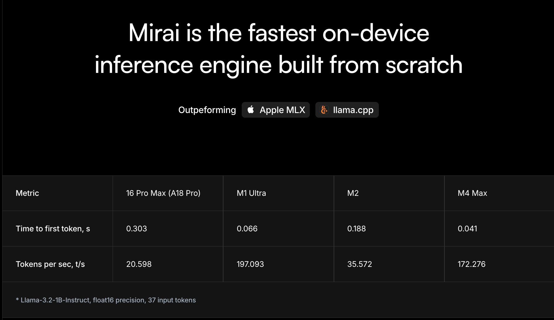 The Mirai team - all deeply technical, and with on-device expertise that is incredibly rare - built their entire inference stack from scratch, and the results speak for themselves: Mirai outperforms Apple’s own MLX framework, delivering a 37% increase in generation speed, up to 60% faster prefill on certain model-device pairs, and a significant reduction in memory usage on supported models as well.